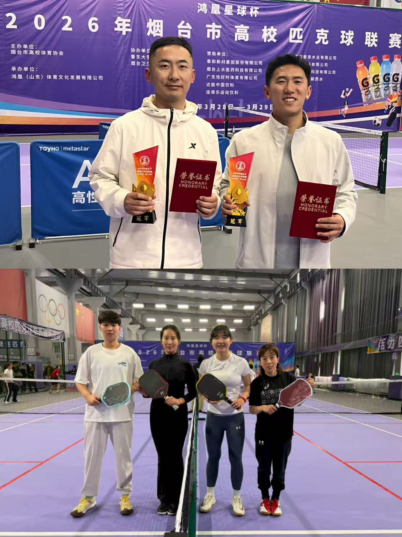 3月30日,由烟台市高校体育协会主办的2026年烟台市高校匹克球联赛在鸿凰星球社区圆满落幕。本次赛事历时2天,吸引了全市18所高校200余名师生参赛,48支团体队伍、150余名单项选手同场竞技。学校体育教学部选派4名教师参赛。经过激烈比拼,白振涛获教工A组男子单打冠军;白振涛、郭赛女获教工A组男子双打冠军;沈敬尧、李雨霏获教工A组女子双打第四名。